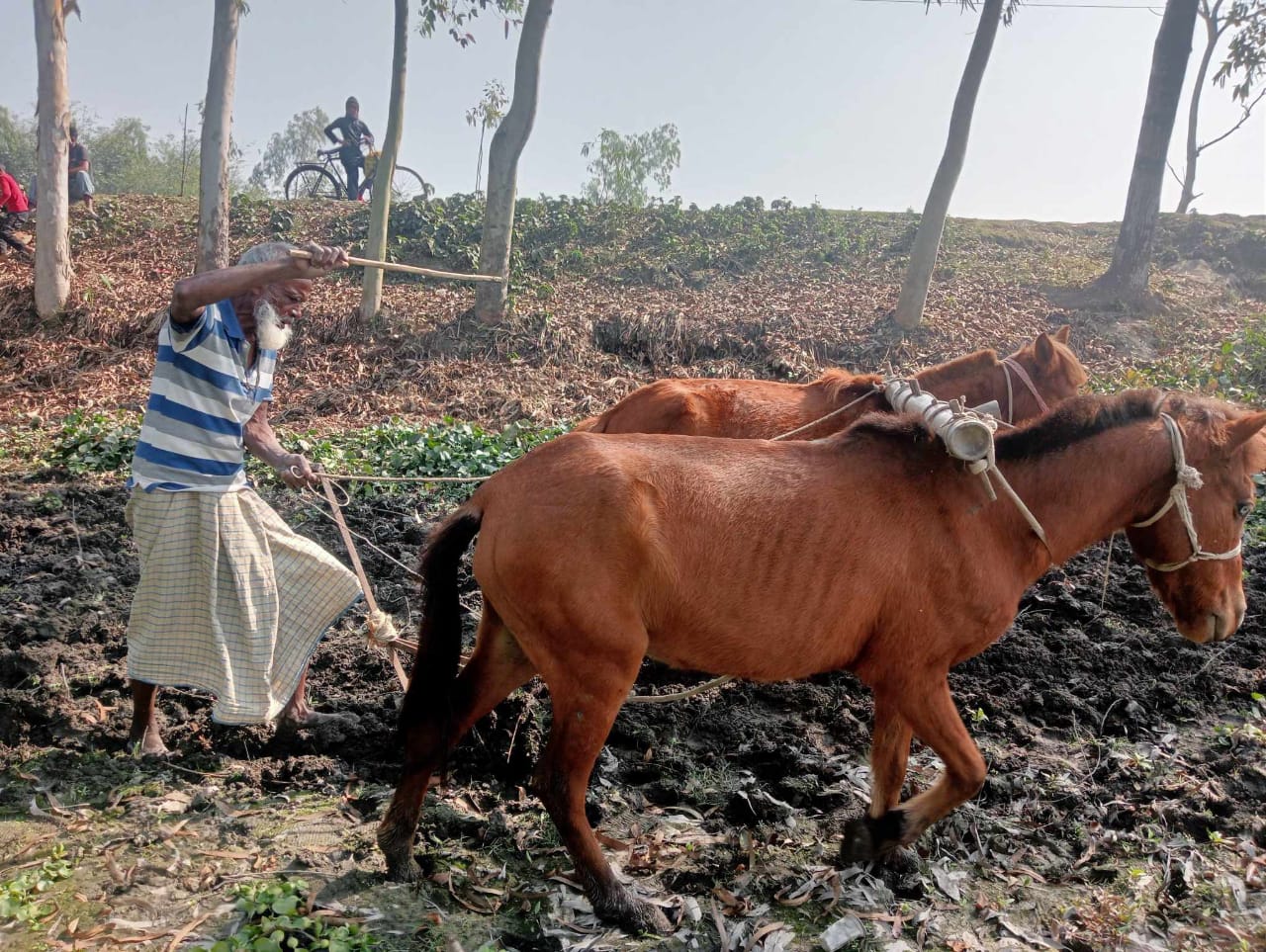 ঘোড়া দিয়ে হাল চাষকারী বৃদ্ধ আব্দুল মমিন(৬৬) বলেন, আমার নিজের কোন জমি নেই। মানুষের জমিতে হাল চাষ করি। বিঘা প্রতি ৫০০ টাকা নেই।