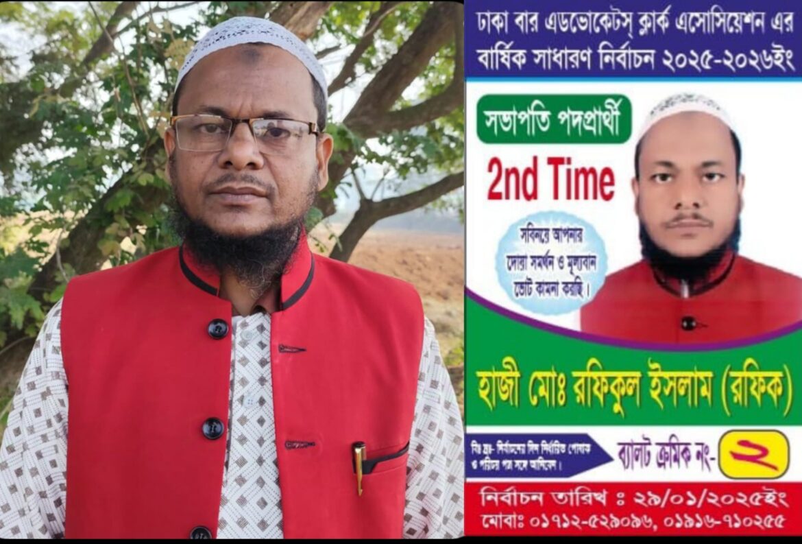 ভোটারদের মধ্যে কৌতুহল আর প্রচারণায় কোর্টের অলিগলি উৎসবমুখর। চলতি মাসের ২৯ শে জানুয়ারি ঢাকা বার এডভোকেটস্ ক্লার্ক এসোসিয়েশন নির্বাচন ২০২৫-২৬ অনুষ্ঠিত হচ্ছে। এই নির্বাচনে আলোচনায় রয়েছে সভাপতি পদপ্রার্থী হাজী মো. রফিকুল ইসলাম রফিক।