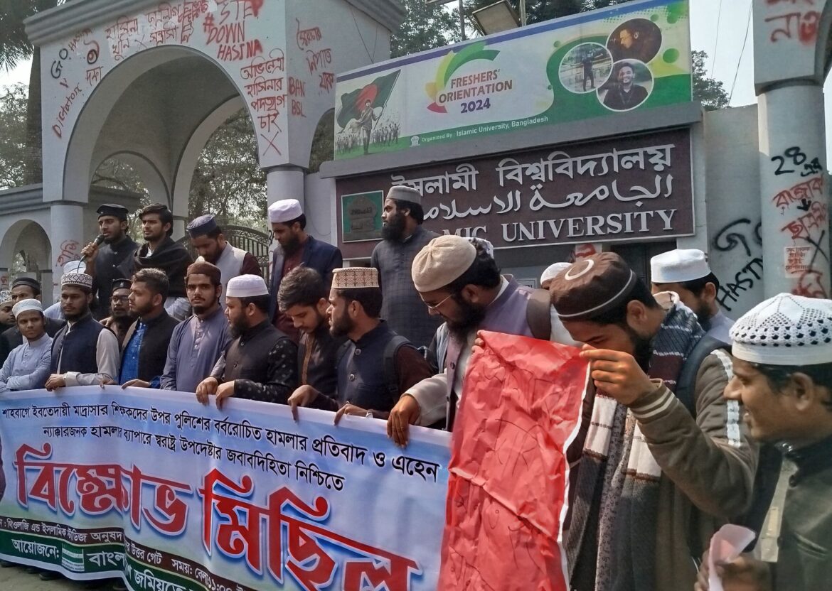 ঢাকার শাহবাগে ইবতেদায়ী মাদ্রাসার শিক্ষকদের ওপর পুলিশের বর্বরোচিত হামলার প্রতিবাদ এবং এ ঘটনার জন্য স্বরাষ্ট্র উপদেষ্টার জবাবদিহিতা নিশ্চিত করার দাবিতে বিক্ষোভ মিছিল ও সমাবেশ করেছেন ইসলামী বিশ্ববিদ্যালয়ের শিক্ষার্থীরা।
