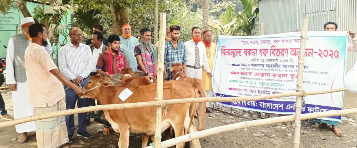 টাঙ্গাইলের গোপালপুরে ‘দুধ, মাংস, চামড়া, গরু পালনে আমরা’ প্রতিপাদ্যে ‘উন্নত জীবনের সন্ধ্যানে’র উদ্যোগে নিম্ন আয়ের মানুষকে স্বাবলম্বী করার লক্ষ্যে বিনামূল্যে বকনা গরু বিতরণ করা হয়েছে। আর্থিক প্রতিষ্ঠান বাংলাদেশ এনজিও ফাউন্ডেশনের আর্থিক সহযোগীতায় শুক্রবার সকালে ‘উন্নত জীবনের সন্ধানে’র নিজস্ব কার্যালয়ে এক অনুষ্ঠান শেষে ৬ পরিবারের সদস্যদের মাঝে ৬টি গরু বিতরণ করা হয়। অনুষ্ঠানটি উদ্বোধন করেন গোপালপুর পৌরসভার সাবেক মেয়র এবং মেহেরুন্নেছা মহিলা কলেজের প্রতিষ্ঠাতা ও সাবেক অধ্যক্ষ খন্দকার জাহাঙ্গীর আলম রুবেল।