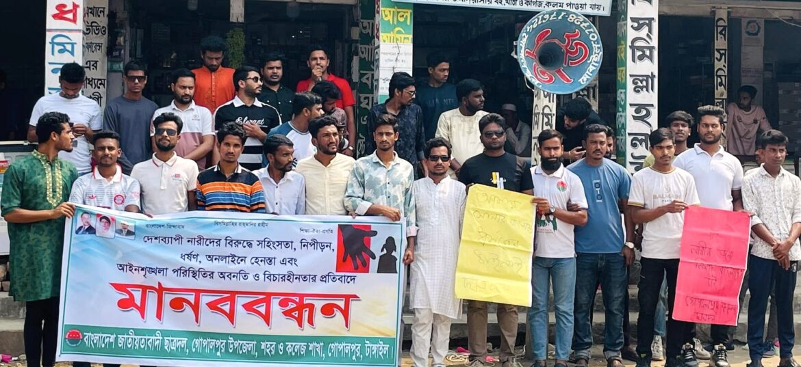 দেশব্যাপী নারীদের বিরুদ্ধে সহিংসতা, নিপীড়ন, ধর্ষণ, অনলাইনে হেনস্তা এবং আইনশৃঙ্খলা পরিস্থিতির অবনতি ও বিচারহীনতার প্রতিবাদ এবং ধর্ষণের ঘটনার সুষ্ঠ তদন্ত ও অপরাধীদের সর্বোচ্চ শাস্তির দাবিতে টাঙ্গাইলের গোপালপুরে মানববন্ধন করা হয়েছে।