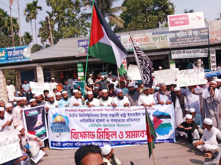 নিরীহ ফিলিস্তিনিদের উপর সন্ত্রাসী রাষ্ট্র ইসরাইল কর্তৃক বর্বরোচিত হামলা ও গণহত্যার প্রতিবাদে টাঙ্গাইলের গোপালপুরে বিক্ষোভ মিছিল ও সমাবেশ অনুষ্ঠিত হয়েছে। সোমবার দুপুরে তৌহিদী জনতার উদ্যোগে পৌর শহরের গোহাটা মসজিদ থেকে মিছিল শুরু হয়ে শহরের প্রধান প্রধান সড়ক পদক্ষিণ শেষে থানা চত্ত্বরে বিক্ষোভ সমাবেশ করেন।