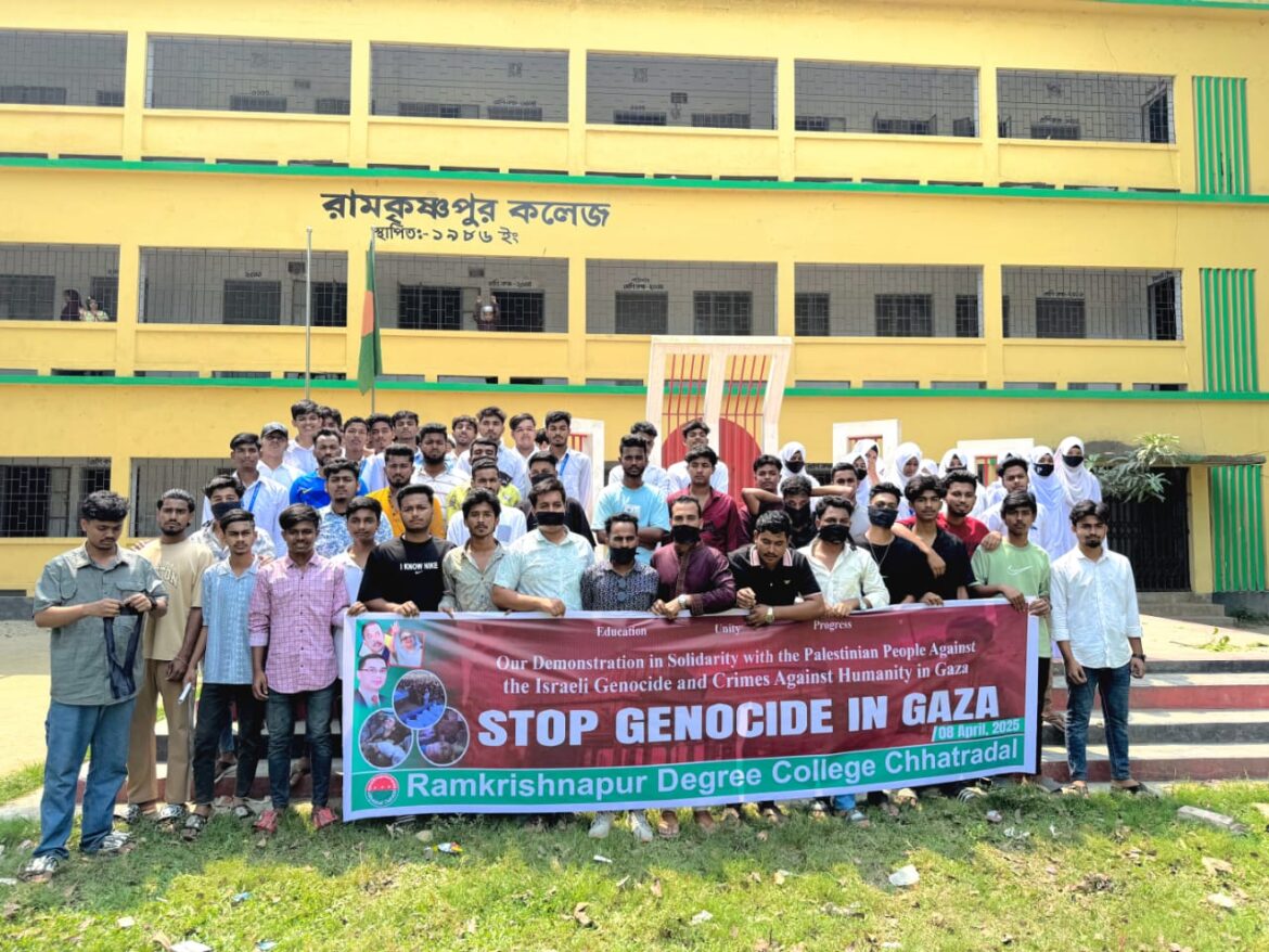 মঙ্গলবার (৮ এপ্রিল) সকাল ১০:৩০ ঘটিকায় উপজেলার রামকৃষ্ণপুর ডিগ্রি কলেজ শাখা ছাত্রদলের উদ্যোগে কলেজ মাঠ প্রাঙ্গণে এ শান্তিপূর্ণ বিক্ষোভ মিছিল অনুষ্ঠিত হয়। এসময় ছাত্রদলের কর্মীরা মুখে কালো কাপড় বেধে ইসরাইলের গনহত্যা, নির্যাতন ও হামলার প্রতিবাদ জানায়। এরপর বিক্ষোভ মিছিল টি কলেজ প্রাঙ্গণ থেকে শুরু করে বিভিন্ন গুরুত্বপূর্ণ সড়ক প্রদক্ষিণ করে। এসময় তারা ইসরাইল বিরোধী বিভিন্ন স্লোগান দিতে থাকে ও বর্বোরোচিত গনহত্যা, নির্যাতন ও হামলার প্রতিবাদ জানায়। এছাড়াও সকল ধরনের ইসরাইলী পণ্য বয়কটের আহবান জানায় তারা।