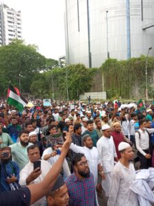 একটু পরপর বিভিন্ন স্লোগানে গাজার পক্ষে অবস্থান ও ইসরায়েলের প্রতি ঘৃণা ও ক্ষোভ প্রকাশ করেন আগতরা।