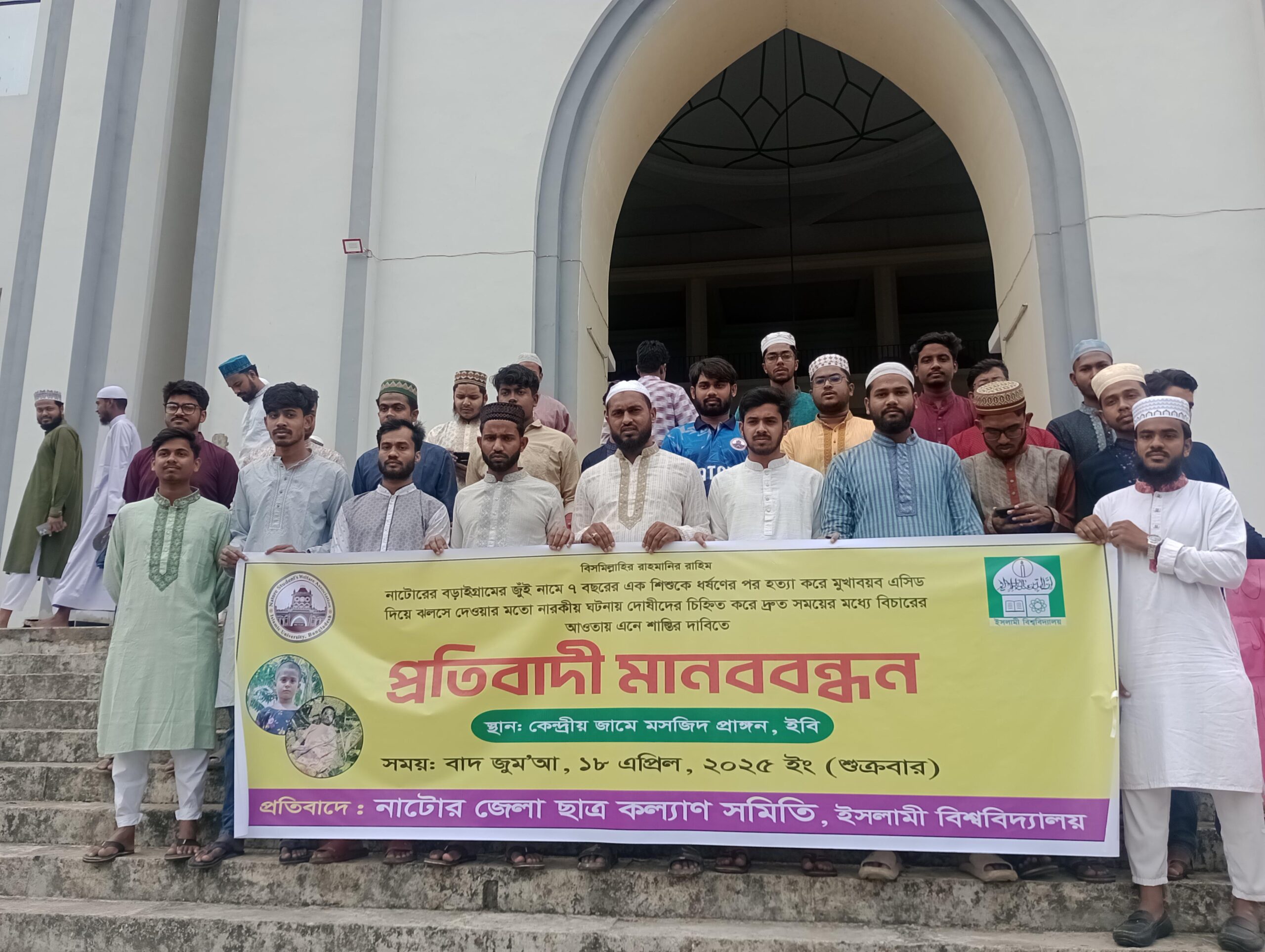 নাটোরের বড়াইগ্রামে জুঁই নামে ৭ বছরের এক শিশুকে ধর্ষণের পর হত্যা করে মুখাবয়ব এসিড দিয়ে ঝলসে দেওয়া দোষীদের শাস্তির দাবিতে প্রতিবাদী মানববন্ধন করেছে নাটোর জেলা ছাত্র কল্যাণ সমিতি, ইসলামী বিশ্ববিদ্যালয় (ইবি) শাখা। শুক্রবার (১৮ এপ্রিল) দুপুর ২টায় বিশ্ববিদ্যালয়ের কেন্দ্রীয় জামে মসজিদ প্রাঙ্গনে এই কর্মসূচি পালিত হয়।