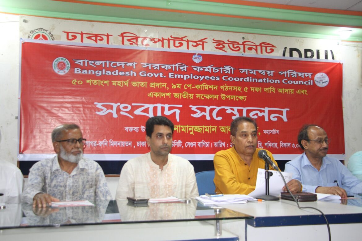 অবিলম্বে ৯ম বেতন কমিশন গঠন, ৫০ শতাংশ মহার্ঘ্য ভাতা প্রদানসহ ৫ দফা দাবি জানিয়েছে বাংলাদেশ সরকারি কর্মচারী সমন্বয় পরিষদ। শনিবার ঢাকা রিপোর্টার্স ইউনিটিতে আয়োজিত সংবাদ সম্মেলন সংগঠনের মহাসচিব নোমানুজ্জামান আল আজাদ এই দাবি জানান। দাবি পূরণের প্রত্যয়ে আগামী ১০ এবং ১১ মে দুই দিনব্যাপী সংগঠনের একাদশ জাতীয় সম্মেলনের ঘ্ষেণা দেওয়া হয়।
