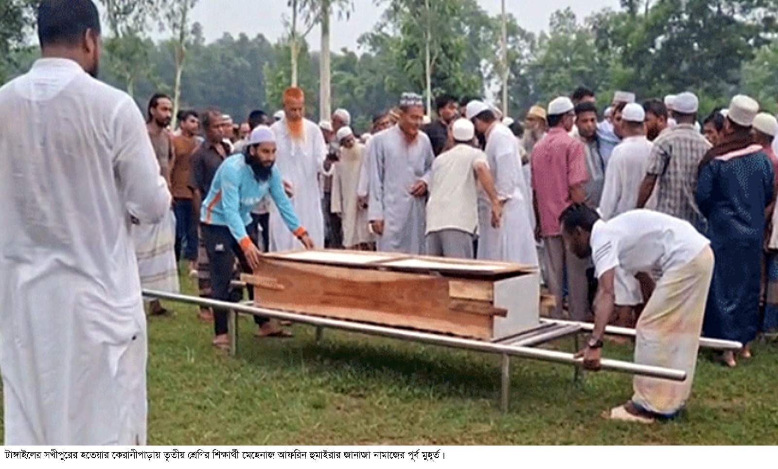এর আগে মঙ্গলবার সকালে বিমান দুর্ঘটনায় নিহত তৃতীয় শ্রেণির শিক্ষার্থী মেহেনাজ আফরিন হুমাইরার মরদেহ ঢাকা থেকে টাঙ্গাইলের সখীপুর উপজেলার হতেয়া-রাজাবাড়ি ইউনিয়নের কেরানীপাড়া এলাকায় নিজ গ্রামে আনা হয়। পরে স্থানীয় ঈদগাহ মাঠে জানাজা শেষে সামাজিক গোরস্থানে দাফন করা হয়। এসময় পুরো এলাকায় শোকের ছায়া নেমে আসে।