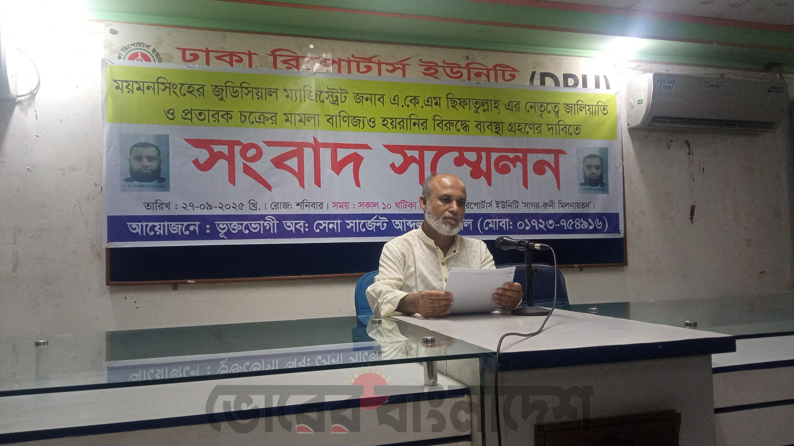 অবসরপ্রাপ্ত সেনা সার্জেন্ট আব্দুল আউয়াল অভিযোগ করেছেন, ময়মনসিংহের বিজ্ঞ জুডিসিয়াল ম্যাজিস্ট্রেট এ.কে.এম ছিফাতুল্লাহ ও তার ঘনিষ্ঠ আত্মীয়রা প্রতারণা, মামলা বাণিজ্য এবং ক্ষমতার অপব্যবহারের মাধ্যমে তার পরিবারকে নিঃস্ব করেছেন। শনিবার ঢাকা রিপোর্টার্স ইউনিটির সাগর–রুনী মিলনায়তনে আয়োজিত এক সংবাদ সম্মেলনে তিনি এ অভিযোগ তুলে ধরেন।