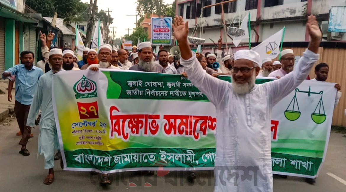 জুলাই জাতীয় সনদের ভিত্তিতে নির্বাচন, সংখ্যানুপাতিক প্রতিনিধিত্ব (পিআর) পদ্ধতি চালু, আওয়ামী লীগের দোসর জাতীয় পার্টি ও ১৪ দলের কার্যক্রম নিষিদ্ধ, ফ্যাসিষ্ট সরকারের সব জুলুম-নির্যাতন গণহত্যা ও দুর্নীতির বিচার দৃশ্যমান করাসহ ৫ দফা দাবিতে শনিবার বিকালে টাঙ্গাইলের গোপালপুরে বিক্ষোভ মিছিল ও সমাবেশ হয়েছে। কেন্দ্রীয় কর্মসূচির অংশ হিসাবে বাংলাদেশ জামায়াতে ইসলামী গোপালপুর উপজেলা শাখার নেতাকর্মীরা এসব কর্মসূচি পালন করেন।