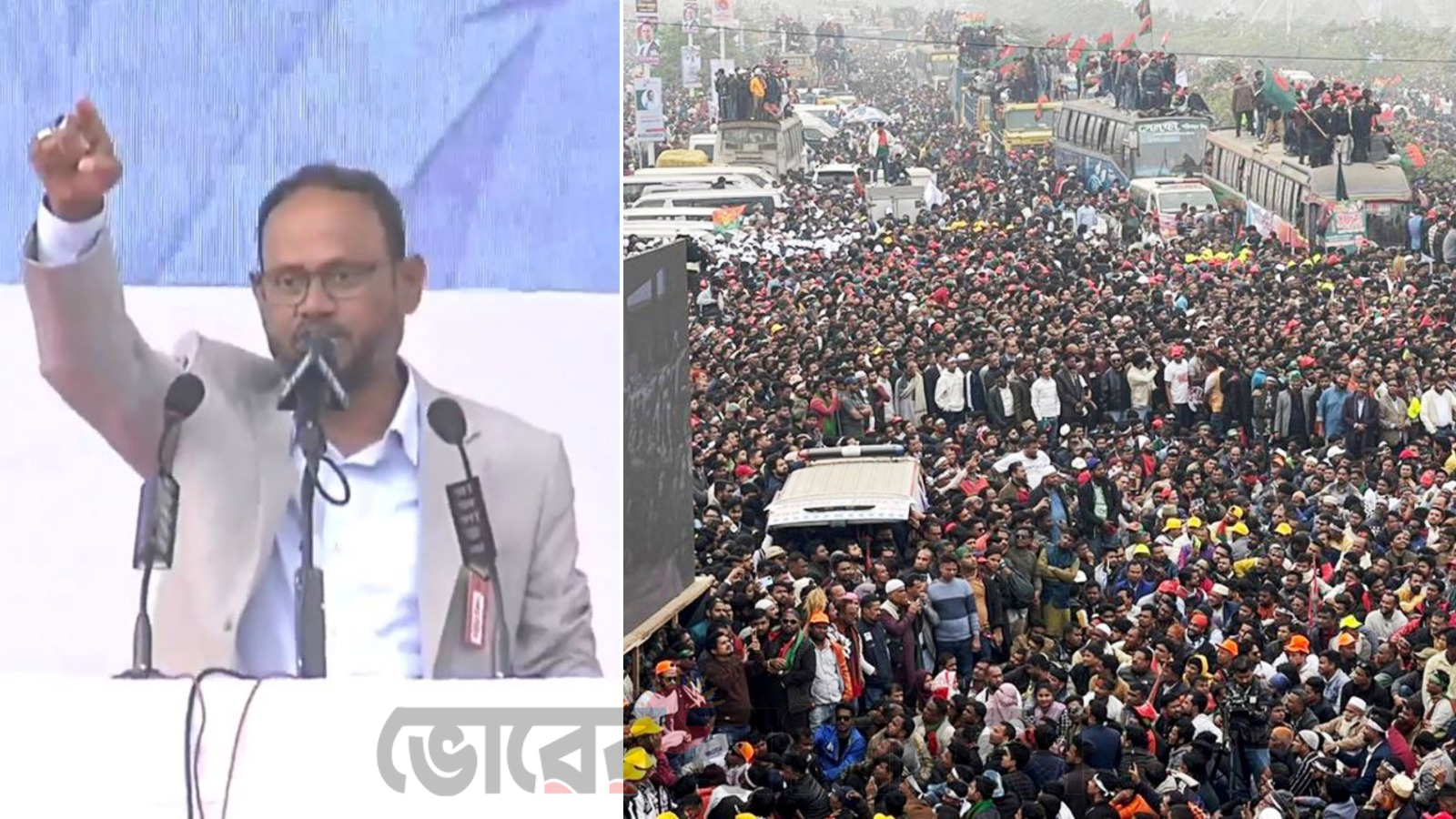 বৃহস্পতিবার (২৫ ডিসেম্বর) বিকেল পৌনে ৩টার দিকে রাজধানীর পূর্বাচলের ৩০০ ফিট এলাকায় আয়োজিত গণসংবর্ধনা অনুষ্ঠানে, তারেক রহমানের মঞ্চে উপস্থিতির আগমুহূর্তে তিনি এসব কথা বলেন।