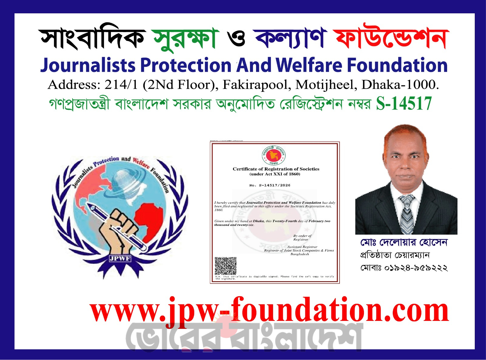 Home » সাংবাদিক সুরক্ষা ও কল্যাণ ফাউন্ডেশনের নিবন্ধন সম্পন্ন, রেজিস্ট্রেশন নম্বর S-14517